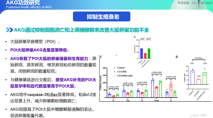 生殖衰老也是衰老里面非常重要的一个表现。这个研究使用了一个大鼠卵巢早衰的模型。这个研究有三个非常重要的结果,首先观察到POI大鼠整体的卵巢里面AKG的含量是显著降低的,第二是使用了AKG的大鼠整个卵巢的储备能力和生育能力有所增加,第三与健康的雄性大鼠进行交配之后,补充AKG的POI大鼠无论是受孕率还是后代的数量都显著高于POI大鼠。