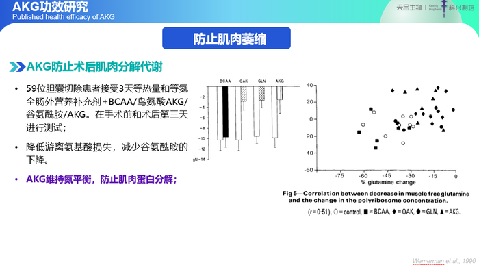 这篇防止肌肉萎缩的研究是来自《柳叶刀》的。有59位胆囊切除患者每天接受等热量和等氮营养补充剂,并且在额外补充BCAA(支链氨基酸)、鸟氨酸AKG、谷氨酰胺或者AKG后,在对比观察中发现,AKG有可以达到维持氮的平衡,防止肌肉蛋白分解的效果。