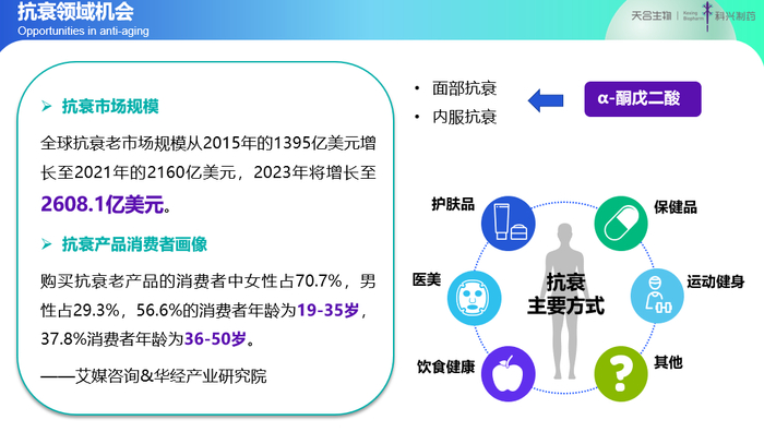 整个抗衰主流的方式,比如使用护肤品、做医美,让我们表面上看起来不那么衰老。同时,还有注重饮食健康、使用保健品、通过运动健身等等。除了这些之外,其他的方式还有很多,比如保持心情愉悦、拥有充足的睡眠等等。总体而言,抗衰是一个持续的过程,需要内外兼修。今天要介绍的α-酮戊二酸就符合内外兼修的特质——既可以外敷,也可以内服。