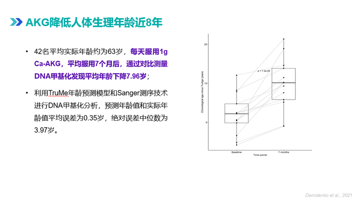 选取了42名平均年龄为63岁的老年人群,通过每天服用1克的AKG钙,平均服用7个月之后,整体DNA甲基化的平均年龄下降了8岁,使用了DNA甲基化的预测模型还是比较准确的。实际的年龄值和预测的年龄值,平均的误差只有0.35岁,并且绝对的中位数误差不到4岁。