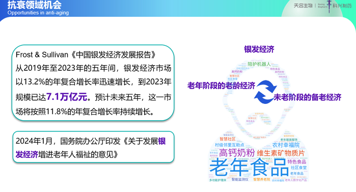 沙利文在《中国银发经济报告》中指出,在2023年,整个银发经济的规模已经达到7.1万亿元,并且预计在未来五年,这个市场将按照11.8%的复合增长率增长。同时在今年年初,国务院办公厅印发的《关于发展银发经济增进老年人福祉的意见》发表。为什么这个文件非常的重要呢?首先它是中国官方文件当中首次以“银发经济”来命名老年经济的文件;第二就是在这个文件当中,它细分了很多老年产业板块,其中就包括老年阶段的老龄经济以及未老阶段的备老经济。