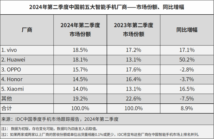 据IDC调研,2024年第二季度,中国智能手机市场出货量约7158万台,同比增长8.9%,延续增长势头,其中在vivo、华为、小米的共同推动下,Android市场同比增长11.1%。