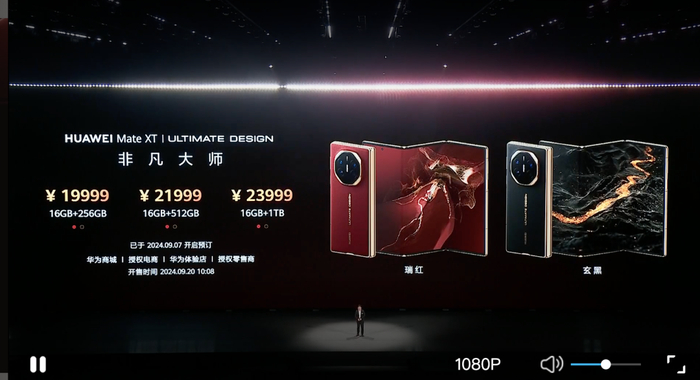 Mate XT同样于9月20号开始发售,提供瑞红、玄黑两款配色,以及 16GB+256GB、16GB+512GB、16GB+1TB 三个存储版本,三个版本分别定价为19999元、21999元、23999元。