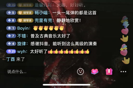 周莹的粉丝黏性很高,新粉丝有疑问,老粉丝们自发在公屏上讲解。热心的管理员中,不乏是从“小白”变成熟稔钢琴曲的。他们是抖音直播里的“老炮观众”,周莹一开播,就去其他群里转发链接,为这位“宝藏老师”吆喝,想让更多人知晓打动过他们的钢琴曲。更多的音乐爱好者被吸引来了,有唱歌的,学其他乐器的,还有做流行音乐的。