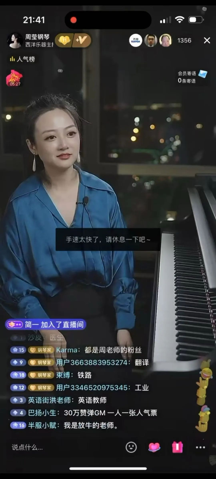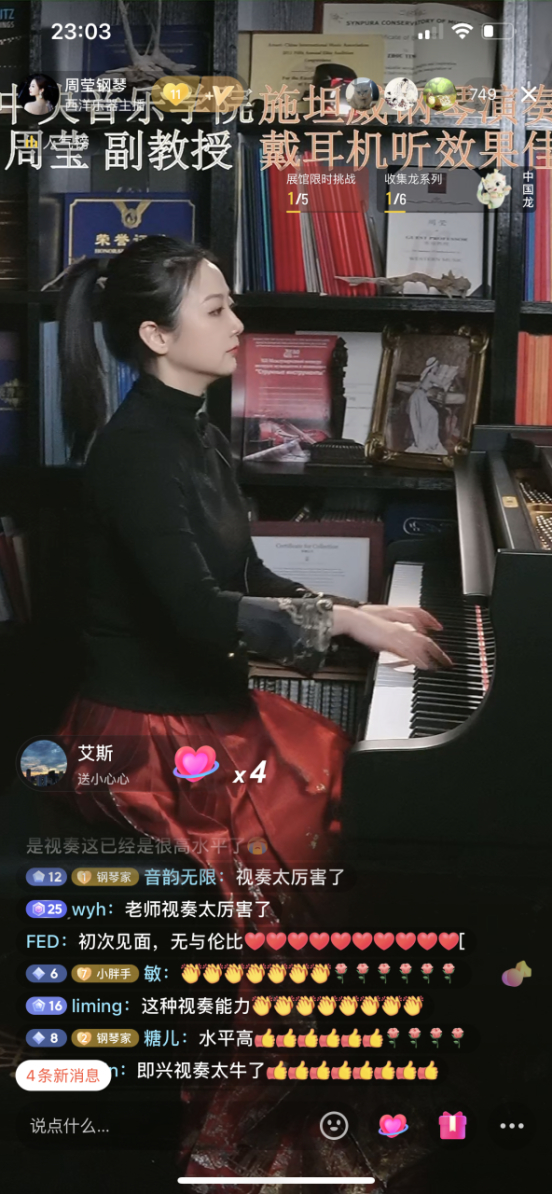 周莹慢慢转了思路,既然想传播古典乐,“得先把观众留住”。何况,弹流行曲对她太轻松了,就像休息一样。她被称作“救场王”,有数一数二的视奏能力,拿到琴谱,抬手就能弹。直播间逐渐热闹起来,粉丝们即兴点歌,玩起“考考周老师”的游戏。