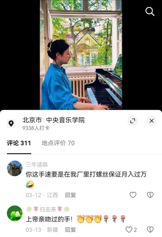 “也许可以把抖音看成一所大众的音乐学院。”在这里,周莹变得越来越放松。网友调侃她,“你这手速要是在我厂里打螺丝保证月入过万”,她看了哈哈大笑。她也学会了和粉丝们开玩笑,粉丝们说点赞点得“手都抽筋了”。她回复,我在这弹,练手速,你们也练手速吗?
