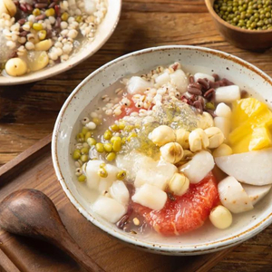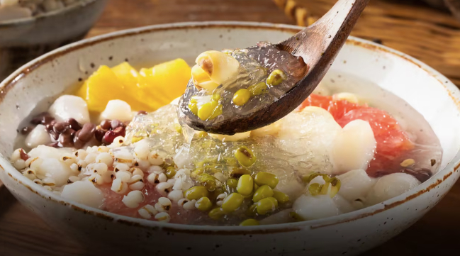 传统的四果汤由莲子、薏米、绿豆、银耳组成。