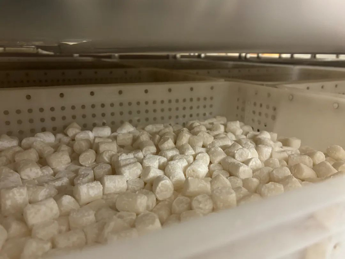 煮熟后的阿达子呈白色半透明状,四四方方的小正方体十分可爱,吃起来软韧弹牙。