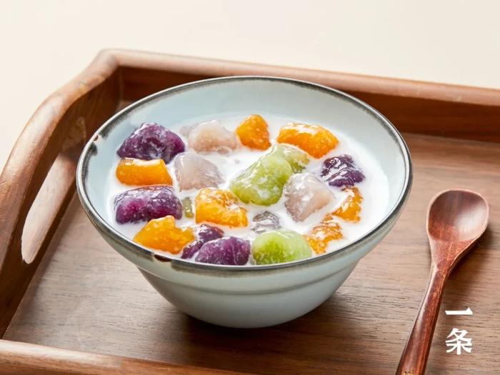 最简单的一种吃法,就是把煮好的四色芋圆,加入牛奶或椰汁,就已经超级美味了!