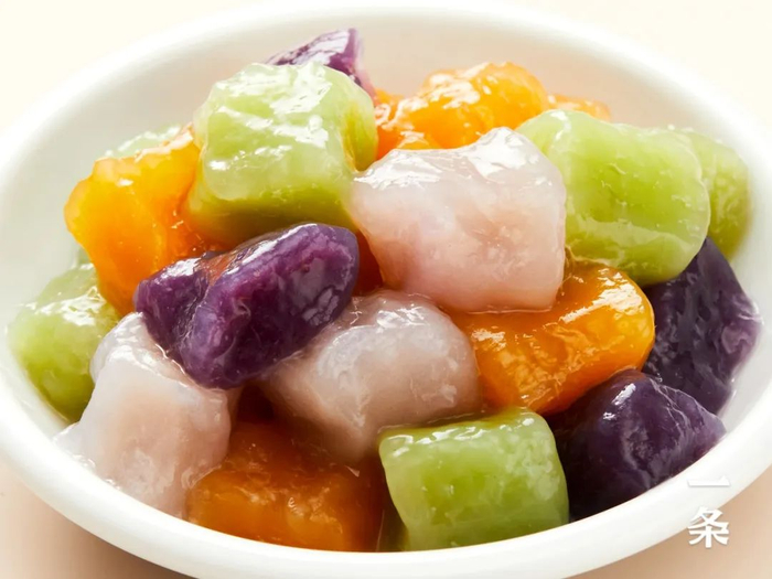 四色混合芋圆,分别为抹茶、芋头、红薯、紫薯4种组成。