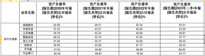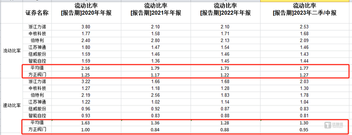 其中,报告期内,方正阀门的流动比率分别为1.25、1.17、1.22、1.27,同行可比公司平均值分别为2.16、1.79、1.73、1.77;速动比率分别为1、0.84、0.88、0.95,同行可比公司平均值分别为1.63、1.36、1.28、1.3;资产负债率分别为65.39%、68.87%、70.56%、67.77%;同行可比公司平均值分别为37.91%、44.46%、46.96%、46.49%。换言之,无论是流动比率还是速动比率,方正阀门均远低于同行均值,特别是资产负债率,方正阀门至少低于同行均值21个百分点。