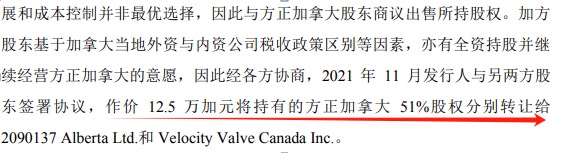 在拿回方正加拿大控制权三至四年后,即2021年11月,方正阀门以12.5万加元的价格将方正加拿大的股权分别转让给了2090137 Alberta Ltd.和 Velocity Valve Canada Inc.。