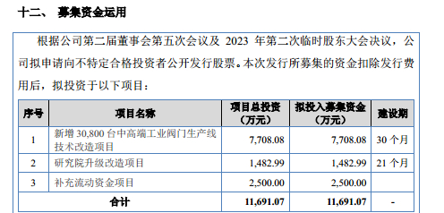 从募投项目上看,方正阀门此次欲募集11691.07万元分别用于新增30800台中高端工业阀门生产线技术改造项目、研究院升级改造项目、补充流动资金项目。