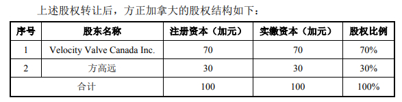 方正加拿大成立于2012年,由方存正出资设立。2016年9月,方存正将方正加拿大70%的股权转让给了Velocity Valve Canada Inc.,同时方存正将方正加拿大30%的股权转让给了方高远,彼时方正加拿大的股权架构如下: