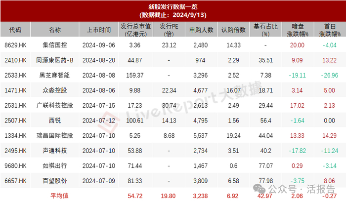 据LiveReport大数据,近10家上市新股平均发行市值为54.72亿,最大市值为黑芝麻智能,最小市值为集信国控;平均发行PE为19.80倍,PE处于中上水平;平均申购人数为3,238人,平均认购倍数为6.92倍;平均基石占比为42.97%,基石平均比例跌下50%;