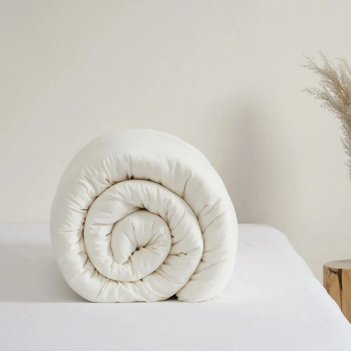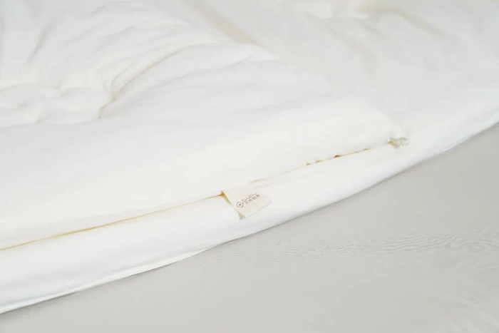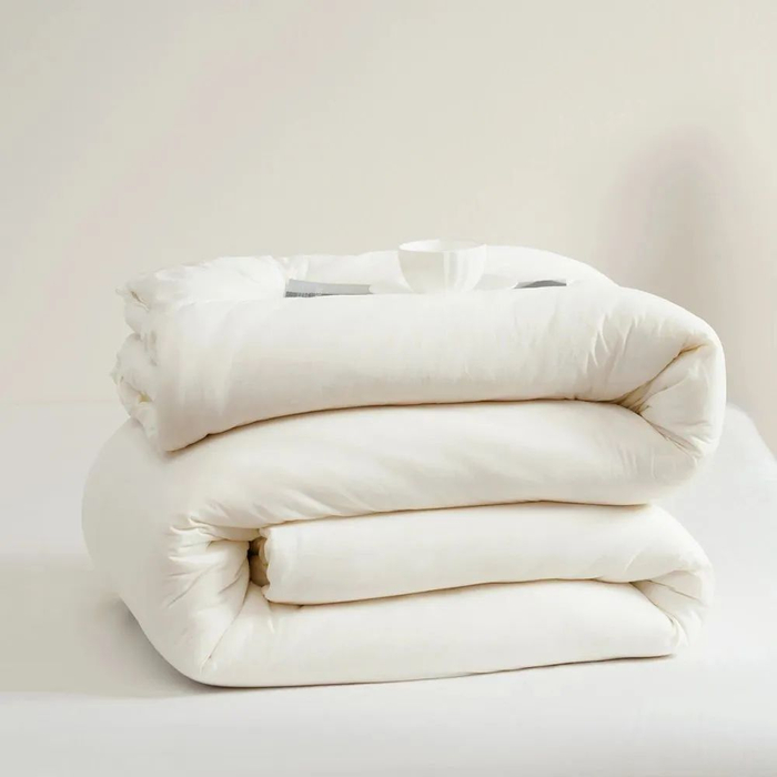 23年版棉花被,使用95%聚酯纤维+5% 氨纶制成柔性纤维,搭配针织工艺,被套即成。
