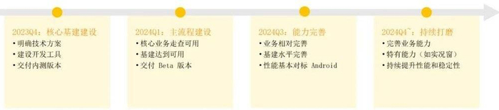 从执行层面来看,项目管理通常会评估开发周期,并设定里程碑。以美团为例,鸿蒙版APP的研发周期包括项目启动、机制建立、过程管理、质量保障、交付验收等步骤,而从去年11月与华为官宣合作后,则确定了从核心基建建设、主流程建设到能力完善、持续打磨四个主要里程碑。其中,今年Q3的里程碑,就是性能基本对标安卓。