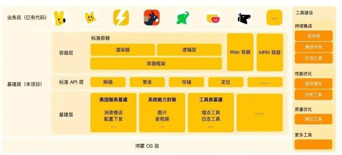 鸿蒙应用的开发,不仅需要采用华为的开发体系,还需要融合公司原本的技术架构和业务逻辑。作为复杂的商业体,美团的APP涵盖外卖、酒店、旅游、团购、零售等多个领域,功能非常庞大。在技术架构上,美团选择了直接从基建层面支持鸿蒙原生应用。基建层直接对接操作系统层,上层则采用容器化方案对接已有的代码资源。如此庞大的业务体系,应用开发落地必然需要比较长的周期。