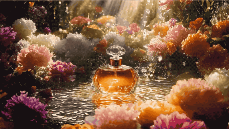 这是一段香水广告,透过豆包·视频生成模型,可以展现水流淌到香水周围的画面,凸显香水的高贵与典雅。