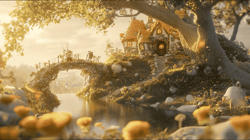 首先是一段“童话王国”视频,花团锦簇在小房子周围,门窗和灯光清晰可见,桥上和房子背后的动物动作栩栩如生。