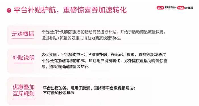然而,这不是小红书的风格。以本地生活业务为例,小红书为新入驻餐饮商家提供的福利包括:限时免保证金、商品笔记亿级流量扶持、门店/商品/笔记一站式经营管理工具、平台活动助力、博主探店合作等。作为对比,今年618大促期间,针对商家报名的活动商品,除了流量扶持,小红书还出资在直播、笔记、搜索等全场域发放补贴券、大额用户优惠券,以提升用户转化。