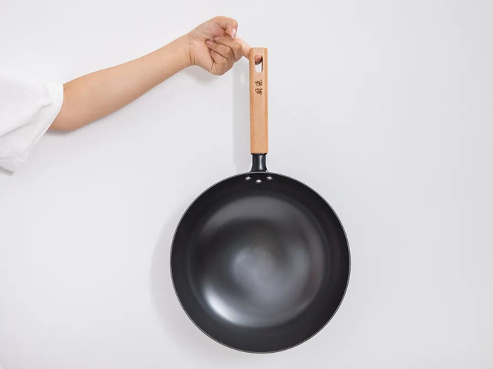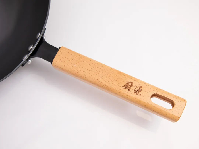 榉木手柄设计,握感舒适,木头手柄不导热,爆炒的时候抓握不会觉得烫手。