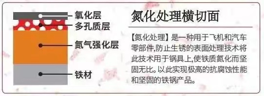 原理是:通过严苛的温度环境,催化不活跃的氮气和铁进行反应,在铁锅表面形成氮化铁层。