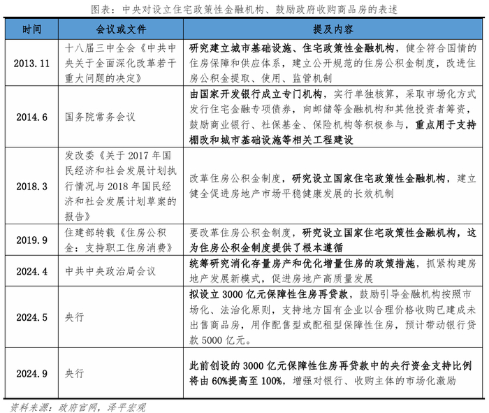 2013年开始,中央曾多次释放组建国家住房保障银行、鼓励政府收购商品房信号。2013年,十八届三中全会在《中共中央关于全面深化改革若干重大问题的决定》中提出,“研究建立城市基础设施、住宅政策性金融机构”。2014年,国常会提出,“由国家开发银行成立专门机构,实行单独核算,采取市场化方式发行住宅金融专项债券”。2018年,国家发改委提出,“研究设立国家住宅政策性金融机构”。