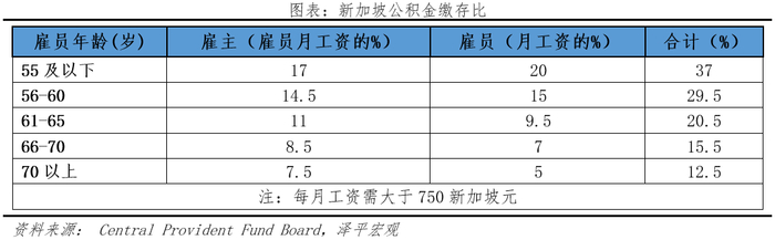实行强制储蓄型中央公积金制度,缴存比极高。根据《中央公积金法》规定,新加坡所有公民和永久居民,不论是雇员还是雇主,都必须按月强制缴纳公积金,任何人不得拒绝或延迟缴纳,否则需如数补缴且加罚利息。除购房及部分投资外,公积金存款只有在雇员退休后才可动用,会员无权决定公积金存款长短。此外,公积金缴存比极高,峰值高达50%(雇员、雇主各25%),目前稳定在37%(雇员20%、雇主17%),远高于中国香港(10%)、中国大陆(24%)等同样推行强制储蓄型中央公积金制度的地区,但会随着雇员年龄增长而适度降低,如55-60岁缴存29.5%(雇员15%、雇主14.5%),60-65岁缴存20.5%(雇员9.5%、雇主11%)。
