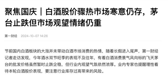 对此,有媒体针对国庆期间的白酒市场进行报道称:白酒股价骤热,市场寒意仍存;茅台止跌,但市场观望情绪仍重。