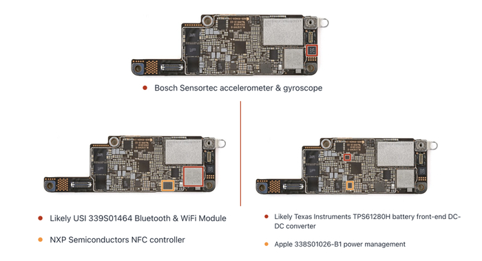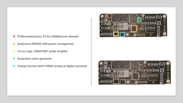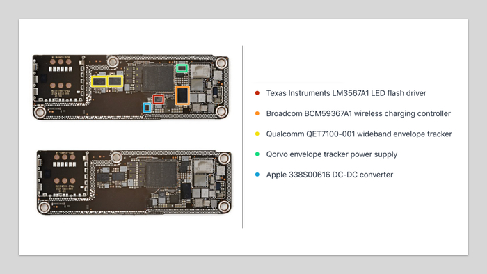 ● RF 板(顶部与底部):主要负责无线连接、射频信号处理以及电源管理,集成了诸如 Qualcomm、Broadcom、Skyworks 和 Qorvo 的模块,这些都是顶尖的无线通信技术供应商。