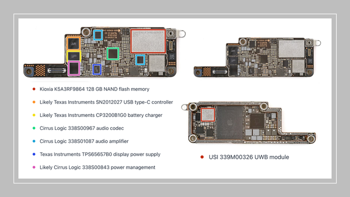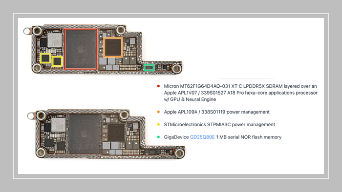 ● 主板:负责处理和存储任务,搭载了苹果自研的 A18 Pro 处理器、Micron 的 LPDDR5X 内存以及 Kioxia 的 NAND 闪存模块。