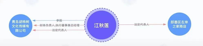 据天眼查信息,目前江秋莲名下共关联了2家公司,分别为青岛胡杨树文化传媒有限公司和即墨区左岸之家商店。