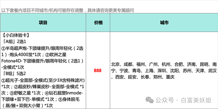 虽然不知道她具体做了什么项目,但今天妖姐为大家打包了【小白体验卡】,7大项目可选,满足你的不同需求。