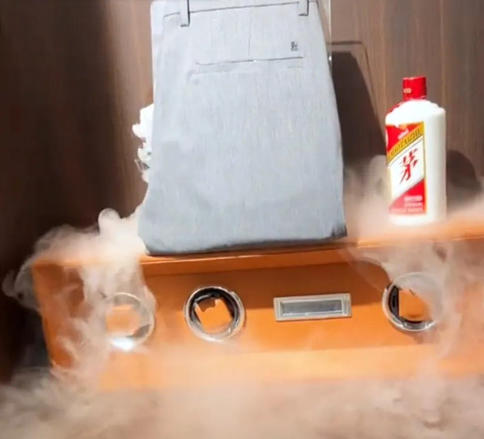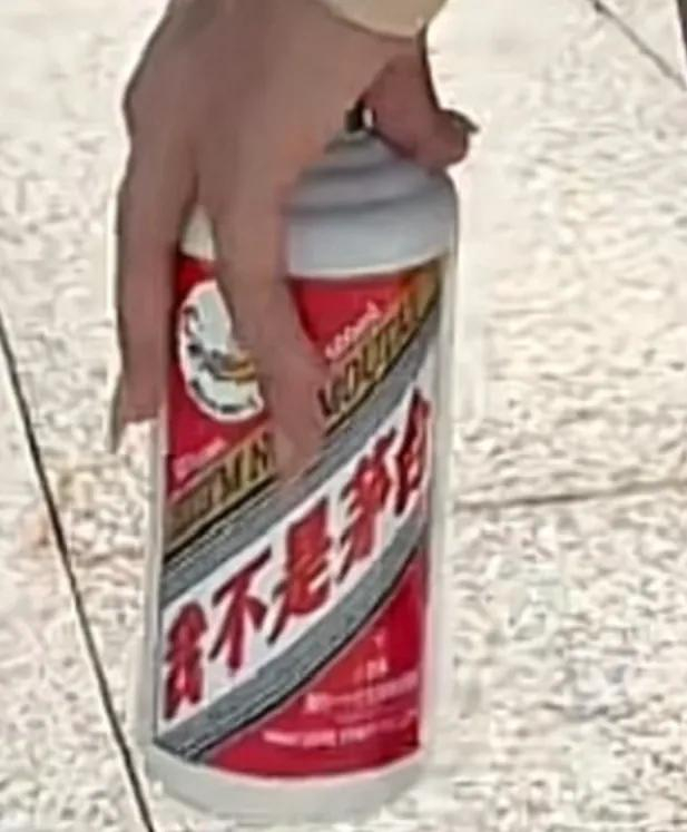 展示裤子透气,拿“这不是茅台”哐哐往裤腿里灌。