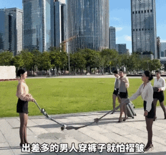 展示不怕褶皱,把裤子拧成麻绳来跳两下。