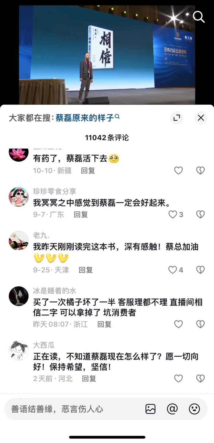 《蔡磊破冰驿站》账号的第三条置顶视频,点赞13.1万,是所有视频里最高的。它是蔡磊在2023年的演讲片段,视频标题是:《相信》,献给每一位努力生活的人。评论区里,很多人在共情坚持的意义,表达鼓励。但也有用户留言,称自己买的橘子坏掉一半,客服不搭理,坑消费者。