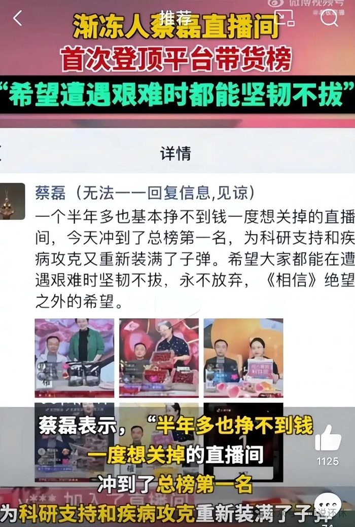从2022年9月投入直播带货算起,蔡磊故事的前半段,是充满正能量的。对于蔡磊而言,直播带货是手段,最终目的是要攻克渐冻症。