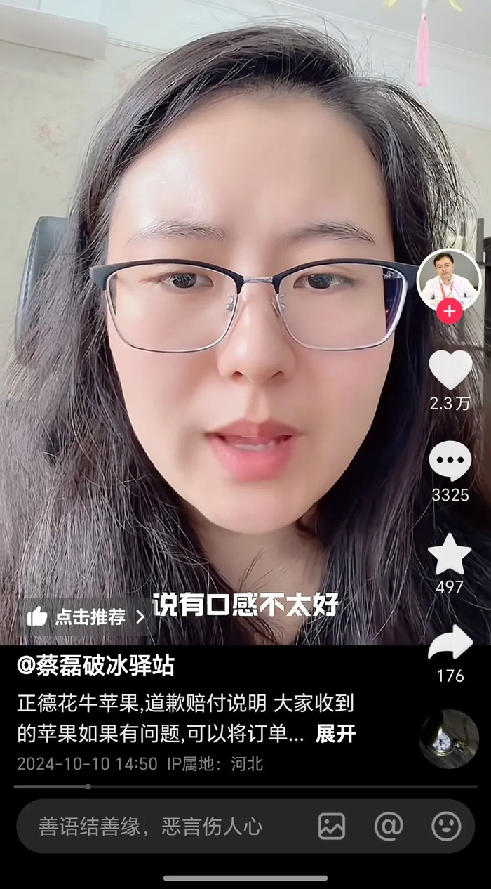 有人在账号评论区连发三条消息称,自己在蔡磊直播间买到的珠宝与宣传不符,质疑其有误导消费者之嫌。仅仅在10月,这已经是蔡磊第二次被质疑产品质量了。上一次是花牛苹果,段睿不得不在10月10日发布了一期道歉视频,并给出赔付方案。