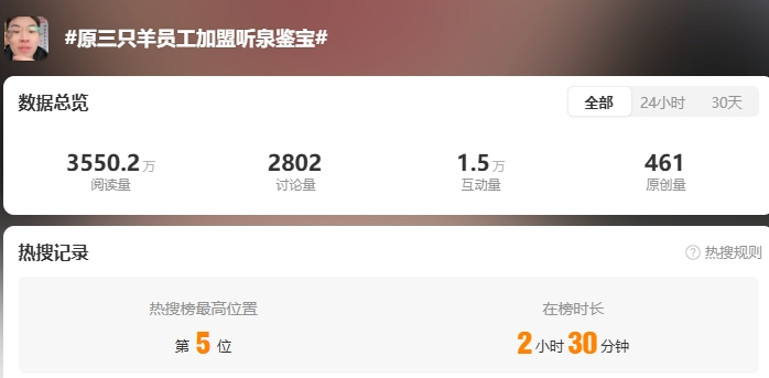 报道发出不久,#原三只羊员工加盟听泉鉴宝#话题火速冲上热搜,引起大众热议。