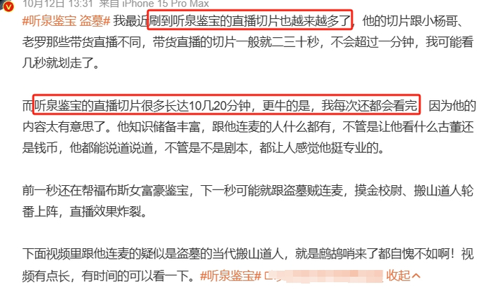 而最近,平台上听泉鉴宝的切片越来越多,且反响热烈。