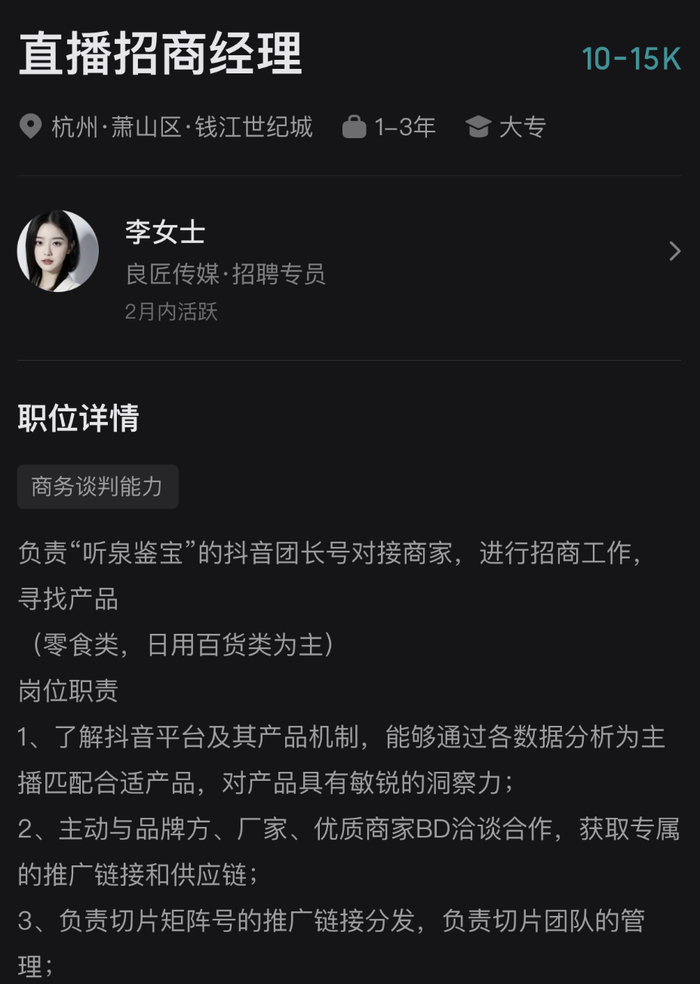 带货首秀后,听泉赏宝被爆开始招兵买马,目标直指带货相关的关键岗位。