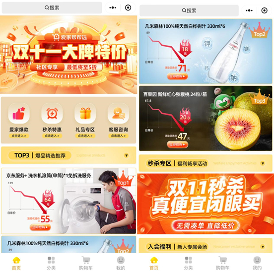 据悉,爱家帮帮选在上线前,曾在多个社区进行过多轮调研,和居民一起讨论生活所需、选品和定价,紧密贴合社区居民的日常高频需求,精心筛选出了个护清洁、上门服务以及食品等多个品类,提供多个低价爆款商品供居民挑选。爱家帮帮选以社区服务为基础将产品利润最大化地回馈给顾客,在全网范围内享有显著的价格优势。比如京东服务+中的洗衣机滚筒(单桶)免拆洗服务,日常价格为119元,而在爱家帮帮选的活动中,优选价直降至55元;百果园的新鲜红心猕猴桃24粒装日常售价为67.8元,经过平台补贴后,活动优选价仅为47元。