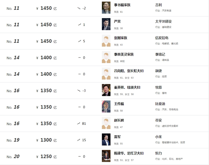 此外,上榜的港澳台企业家共153位,比去年多11位,占比上升3%至14%。其中台湾97位,比去年多15位;香港56位,比去年少4位。李嘉诚、李泽钜父子和李兆基家族进入榜单前十,财富分别是2000亿元和1750亿元。