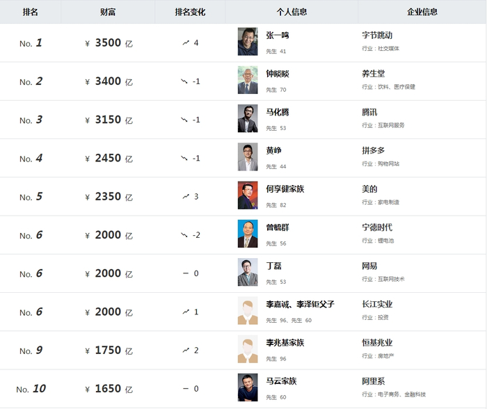字节跳动41岁的张一鸣财富比去年增长1050亿元,以3500亿元第一次成为中国首富,他是过去26年来第18位中国首富,也是第一位“80后”白手起家的中国首富。