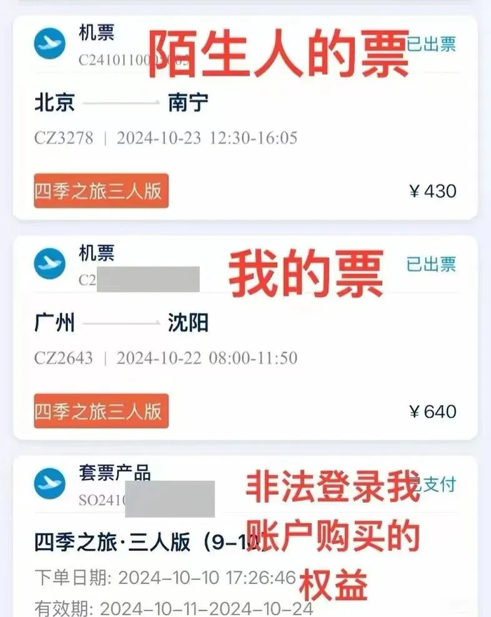 更离奇的是,她发现自己被购买添加了“四季之旅三人版”套餐,订单列表里出现了两个陌生人的机票订单,三张票的出行时间、起降地点都不一致。