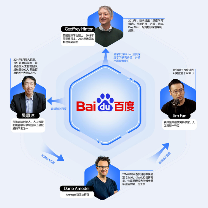 之后就又招来了吴恩达,提供了“GPU随便买”的优厚条件。吴恩达来了之后,又找来了Dario Amodei和Jim Fan。一波又一波的顶尖人才在百度汇聚。李彦宏对此表示,“一代一代的人,就把优秀的人才能够吸引过来,当然这些人后来阴差阳错,又离开了百度,我觉得也没问题,人才的这种流动对整个行业是健康的。”