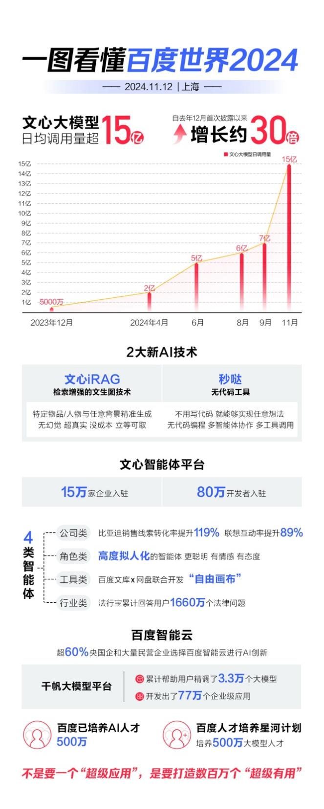 在2024百度世界大会上,有关前一年的信息是:文心大模型11月初日均调用量已经超过15亿,相较一年前首次披露的5000万次,增长约30倍。