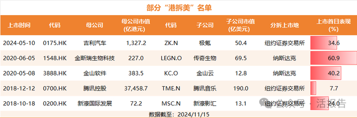 港股分拆上市案例有很多,选择美国为上市地的也不在少数,LiveReport大数据整理了部分“港拆美”上市公司名单,包括吉利汽车分拆极氪、金斯瑞生物科技分拆传奇生物、金山软件分拆金山云、腾讯控股分拆腾讯音乐、新濠国际发展分拆新濠影汇,子公司上市首日表现都比较亮眼。