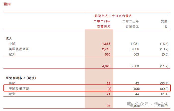 随着猪肉产品价格上升、生猪饲养成本下降及公司的成本控制见效,公司业绩逐步改善,美国及墨西哥业务经营利润亏损同比大幅收窄99.2%,实现公司2024年半年度的扭亏为盈。